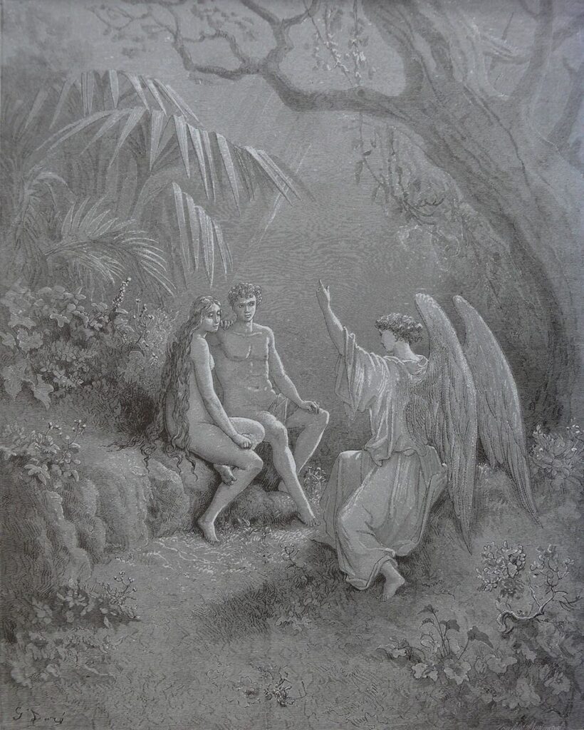 Raphael Warning Adam and Eve – Gustave Dore – 1866 – Source
