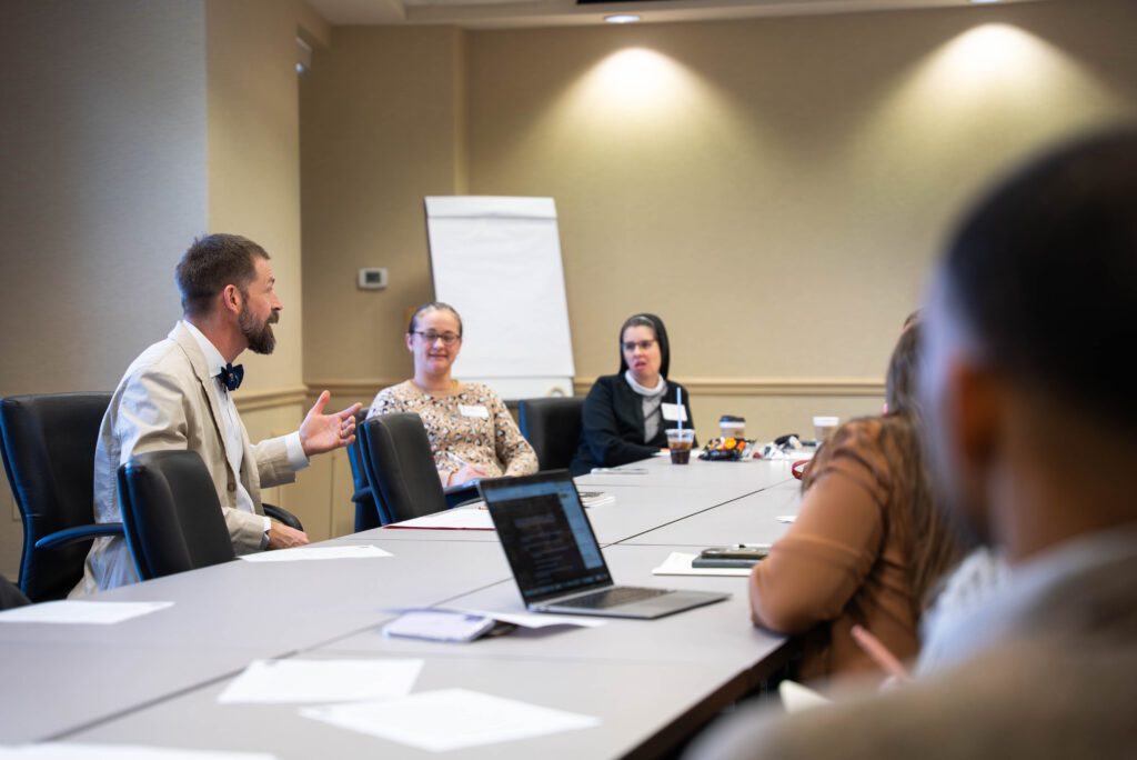 The conference opened Wednesday evening at the Bolger Center with a welcome reception and a headmaster’s lecture by Alvaro de Vicente, followed by a group dinner. Thursday’s programming paired semi-plenary lectures with small-group discussions. Andrew Reed, Head of Middle School, explored Freedom and Formation, emphasizing the importance of freedom in education and why working with parents is not an optional add-on, but core to the mission of a school. Michael Moynihan, Head of Upper School, followed with a lecture on Curriculum and Pedagogy for Boys, prompting small-group conversations on engaging boys in class. Optional office hours allowed participants to meet one-on-one with Heights faculty, asking questions specific to their own schools and gaining practical resources to bring home.